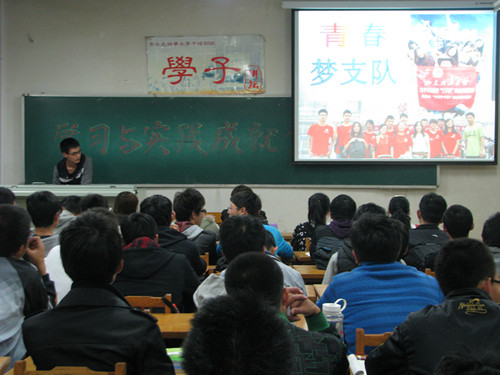 刘磊首先提出“员工,为学习而生”的主题思想,作为国家奖学金的获得者,他从自身经历出发悉心为同学们分析和解答学习中存在的困惑,与在场同学分享三年来学习的苦与乐,针对同学们提出的如何解决学习中的惰性问题,他这样建议,抗击懒惰的最有效途径是树立目标,有计划的去完成,积少成多。此外他还告诫同学们在打工和学习二者之间切不可本末倒置。他说道,进入大学,机会虽多,但优秀的学习成绩也往往是你获得许多荣誉的前提,我们的未来还是需要坚实的知识来铺路。随后,刘磊从校内实践和校外实践两方面来进行阐述老员工应该如何进行社会实践。谈到校内实践方面,他积极鼓励同学参加科技创新类的公司活动以锻炼自身的创新能力,并参与员工组织以锻炼自身的社交能力。其后,刘磊则通过播放其参加的“青春梦之队”暑期实践团活动的ppt,以军民共建和保育院支教为主线,矿山走访和调研为辅线为在场同学展现了一幅实践全景图,由此让大家对社会实践的形式有初步的了解。实践活动中传递出来的正能量感染着在场的每一个人,其中以实践队员们与孤儿院孩子亲密接触的场景令人尤为动容,大一新生纷纷表示今后会积极参加此类的活动。刘磊说,社会实践中收获的不仅是知识,更多的是团结协作的精神以和不畏艰险的意志。大学时代尝试去做一次社会实践,无论心酸苦楚,当你回首,会觉得弥足珍贵。