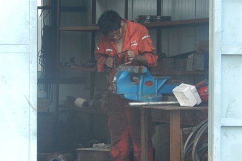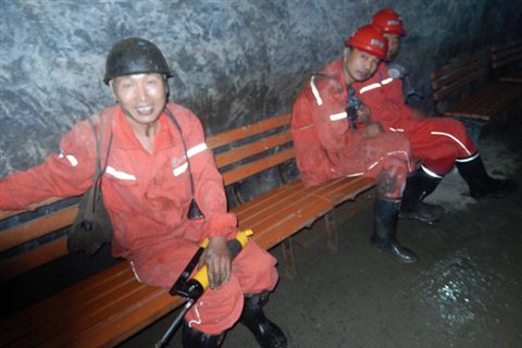 一身黄色工作服,有些蓬乱的头发,始终盯着工件的眼睛,镜头中的矿工正在认真地工作,丝毫未曾发现实践团队的到来。“你们看,那个工人好陶醉啊”,团队中的活泼女生小张说到。也许被一群人打扰到,矿工小伙停下手中的工作和队员们交流起来。“俺家是山东莱州本地的,离家近的工作也挺不错”“俺不是老员工,不过俺也会干些技术活”小伙高兴地说起。其淳朴真实的语言深切打动了在场的每一位队员。