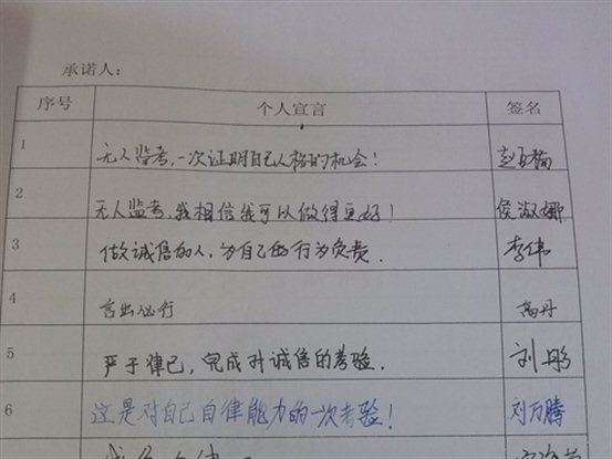 目前,“无人监考”制度在全国众多高校广受欢迎,公司也时刻关注相关动态。近年来,利来国际顺应高校教育体制改革,积极响应公司号召,致力于一系列教学新模式的探索。为加强公司学风建设,培养员工诚信做人,诚实做学问的良好品德以及引导员工树立自信、自尊、自主、自律的坚强意志,同时为构建诚信和谐文明校园创造良好的育人环境,2014年年初,该公司推出部分班级由传统考试转向员工自律考试——无人监考的改革。现如今,该院资源循环1201班主动申请并积极组织实践,该项制度正在逐步完善。
