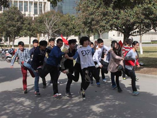 活动伊始,两编队各派出代表解说自己旗帜的含义,并分别演唱自己编队的队歌。英雄联盟队以好汉歌为曲调,自己填词,充分表现了队伍的鲜明特色。而另一队则以手拉手,心连心为主旨,体现了队伍的团结和谐。第一项进行的游戏是急速前进,双方各自战成一列,要求后边的人左手抬起前边的人的左腿,右手搭在前边的人的右肩形成小火车,最后一名同学也要单脚跳步前进,不能双脚着地。场地上划好起跑线和终点线,其距离为30米,最终英雄联盟队小胜一筹。接着是齐眉棍活动,队员们分站两侧,相向站立,共同用手指将一根棍子放到地上,手离开棍子即失败。游戏开始,队员们跃跃欲试,然而一个看似简单的项目却难倒了各位队员,他们想尽各种办法最终得以顺利完成。接着陆续进行了驿站传书,耳朵跟心一起走,盲人方阵,可怜的小猫,无敌风火轮等游戏,大家玩得不亦乐乎,并从中学到了很多道理。