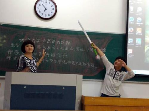 资循环1401团支部首先自编自演了一个紧扣主题的小话剧,随后每一名同学都在纸上写下了自己的中国梦,接着全班同学一起观看了习近平总书记的演讲,观看完后同学们各自谈了对“四进四信”的理解与认识。最后同学们针对“无人监考”畅谈了自己的想法。