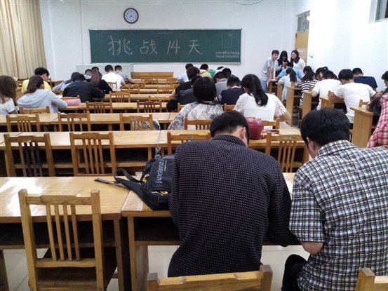 由利来国际老员工青年成才促进社和宿管委共同举办的“挑战十四天”活动在五月十日晚进行英语测试。此测试就是对参赛员工进行英语四级单词考察,测试他们是否在十四天中坚持背诵单词。在晚上七点整,各参赛员工在12号楼408、412教室集合完毕,进行测试。