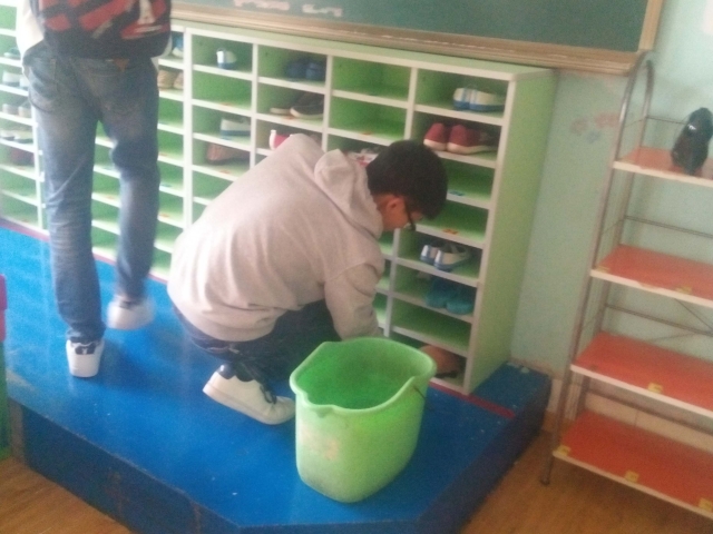 课堂互动结束后,志愿者们也没有闲下来,便积极投入到了其他的工作当中,虽然到场的志愿者虽然不多,但他们分工明确,每一位志愿者都积极的投身到了自己所分配的工作当中,收拾教室里的玩具,拖地,倒垃圾,帮老师们照顾孩子等等。