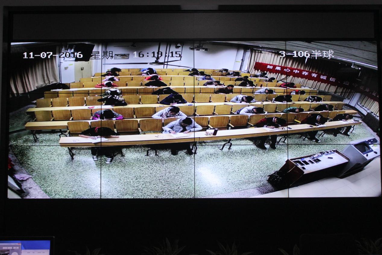 开考之前,资源循环1401班同学主动把课本、书包、手机等放在讲台上,按照学号有序坐好。任课教师刘爱菊发放完试卷确认没有问题后也来到监控室。在监控室中,通过监控画面可清晰看到,考场中的同学们自觉自律,认真答题,公平竞争,诚信考试。整个考场纪律良好,考试过程井然有序。