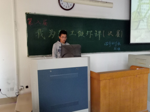 各参赛队伍依照环评的具体要求进行演讲和问答。答辩所涉及问题广泛,环评方案样式繁多,如饮用水问题、噪声问题、落叶清理 、废旧自行车处理、雾霾及酸雨形成问题等。在十一支队伍的演讲当中,他们依据各自的实验数据、统计标准,对当前理工大的现状进行了综合性的分析,并提出了一些具有建设性的的建议。比赛持续了两个多小时,各组的议题讲解也接近尾声。