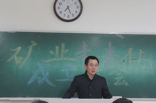 会议伊始,矿业未来社社长李如峪对该社团相关情况进行简明介绍。随后,社团指导老师张晓君博士就矿业未来社的未来发展规划以及采矿专业的相关情况向大家做了简要说明,同时,他向大家介绍了有关“专业+”与该社团未来发展阶段的联系,并表示将“专业+”与社团紧密结合,将会打造出具有凝聚力、技术型的社团。随即,由社团会员代表李倩同学发言,她充分地表达出自己作为矿业类专业员工对此社团成立的感激、兴奋之情。随后,于福顺为该社团授旗,刘志河则宣布矿业未来社正式成立。