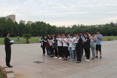 在鸿远楼前,随着升旗仪式的结束,部分团支部成员在“不忘初心跟党走,一学一做振中华,资环学子用实际行动向党的十九大献礼”的条幅上依次签名,表达自己对践行团中央“一学一做”教育实践活动的决心。随后,在各班级团支部书记的带领下,部分班级采用宣誓、演讲及朗诵等形式迎接即将开始的第十九次全国代表大会,同学们个个精神饱满,声音洪亮,充分表达对中国共产党的热爱和敬重,表现自己对十九大的热切期待。与此同时,第十七届员工会骨干成员也通过卡片寄语的方式庆祝党的十九大早日到来,同时表现出对人民代表大会制度的认可和尊重。人民代表大会制度是我国的根本政治制度,是人民“当家做主”的根本保证,通过人民代表大会可以反映出基层百姓的心声,为国家的更好发展打下坚实基础。临近结束时,参与此次活动的团支部成员在“喜迎十九大”展板前以不同的方式合影留念,共同祝愿我国第十九次全国人民代表大会顺利召开。