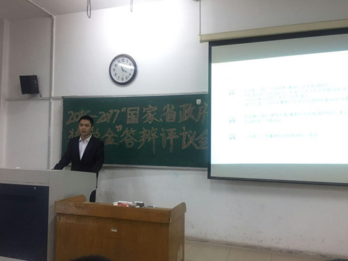 参与此次答辩会的有国家奖学金候选人四名,省政府奖学金候选人三名。答辩会伊始,赵鹏简单介绍了评选委员会的人员组成,同时,对国家奖学金、省政府奖学金的参评条件、评选方法作了详细介绍。