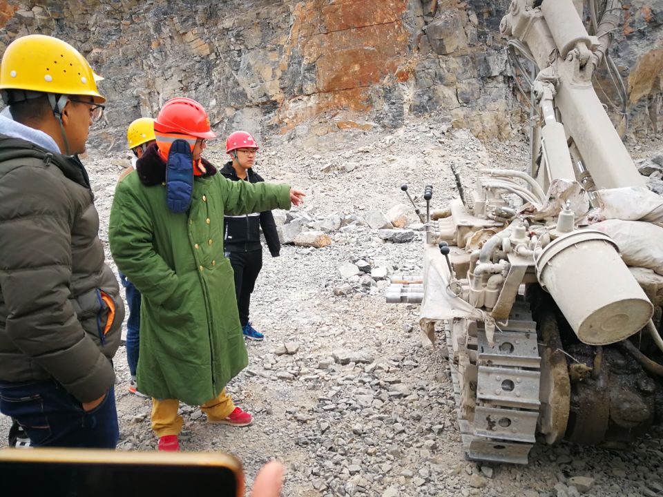 他表示,小上峪矿主要是石灰石矿山,所采矿石主要用于炼制钢材,烧制水泥或者做建材,矿山为山坡露天矿,通过台阶逐步逐层的开采,矿山主要采用穿孔爆破方式开采矿石,包括穿孔、爆破、铲装、运输、破碎等主要步骤。此外,他还带领我们参观了潜孔钻机,其主要用于地面打孔,打孔后填注炸药。