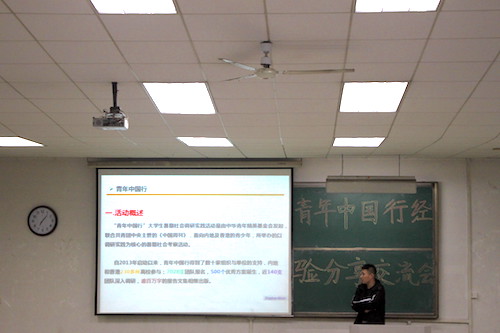 交流会伊始,由张家铭简单介绍青年中国行2018启动的相关情况,他向同学们介绍了往届青年中国行的百强成员以及在这系列过程中的经历,随后他鼓励同学们积极加入青年中国行并向大家详细介绍了申报流程.然后,由杜天昊向同学们分享此次”青年中国行的实践经验,他向大家详细介绍了他们的团队“工业的脊梁”,并向同学们分享以前与一些青年中国行的优秀团队的交流,从选地,实践调研报告的撰写等方面向同学们全面的分享了社会实践的经验.从中大家了解到矿山建设如火如荼,中国矿业建设的逐步进步。接下来由武凯和邓志超分别介绍了自己团队在社会调研,社会服务等方面的实践经验,通过照片等向同学们生动的展示了社会实践的重要意义和作用.
