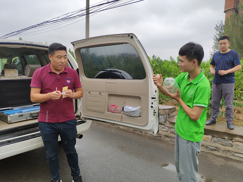 早上8点,团队成员准时到达山东省环境监测中心站,王绪刚接待了团队一行人。他向团队成员简单介绍了此次嗅辨检测的主要流程:上午外出进行实地取样,下午进入实验室配气并进行嗅辨操作,最后公式计算检测结果。取样前,王绪刚告知大家须将三个取样瓶内置于真空状态,外出取样时应将瓶口向上倾斜45°方向,并简单介绍了取样过程中的一些注意事项等,随后,他带领大家一起去器材室准备相应的仪器设备。天公不作美,在团队外出取样前,室外下起了小雨,为了不影响取样样品的相关浓度等性质,王绪刚带领大家到附近的炼油厂进行就近取样。到达炼油厂后,为了让团队成员切身体验取样过程,王绪刚将取样仪器交给实践团队成员,并监督、指导成员操作,保证取样准确有效,取样过程中,团队成员实时记录取样点的风向、温度及湿度信息。取样完成后,大家一起回到环境监测中心恶臭实验室,并于下午进行样品的前期处理及嗅辨检测工作。