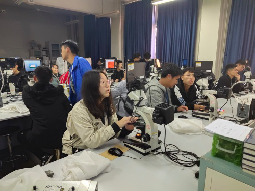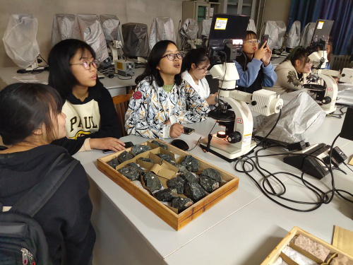活动开始前,各同学两点准时集合完毕,并由杨依舟带领进入实验室。实验开始,杨依舟对仪器使用做简单介绍,随后同学们开始实验。首先,他们通过肉眼粗略观察部分矿石和化石标本的外形以及结构,随后通过偏光显微镜仔细观察玻片下的矿石层理结构,使同学们对矿石有更加深入的了解。同学们来到309实验室。杨依舟通过PPT简要介绍仪器设备的使用方法并让同学们组队合作使用配有电子显像屏的偏光显微镜来观察标本,了解岩石的层理结构。最后,同学们来到109实验室,同学们对照矿石名称认真观察。