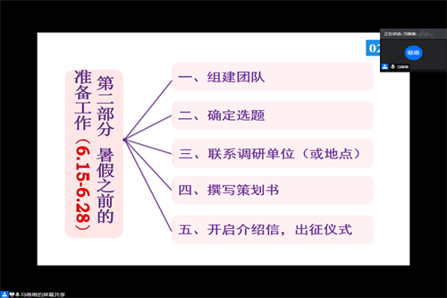 冯琳琳将2020年度思想政治理论课实践教学分为思政课实践教学方案简介、暑假前的准备工作、实践调研中的基本要求、暑假后的考评、总结及注意事项五个部分依次进行解读。在对思政课实践教学方案进行简要介绍后,冯琳琳着重强调暑假之前的准备工作。她提倡员工组建团队,叮嘱员工仔细研读实践教学的相关文件,并提醒同学们关注时间安排和主要工作流程,防止出现超时提交的问题。对于实践调研中的基本要求,她希望同学们认真撰写调研报告,避免弄虚作假,保证引用明白、行文规范。她强调同学务必要按照具体要求完成暑假之后的考评和总结工作,并叮嘱团队成员在实践过程中及时沟通,注意安全。最后,赵鹏对冯琳琳的解读内容进行简要总结。除此之外,他建议同学们在实践准备阶段多与学长学姐交流经验,吸取教训;在实践过程中注重团队协作,保证团队内部合理分工。他鼓励同学在实践中锻炼自己,为未来步入社会奠定基础。