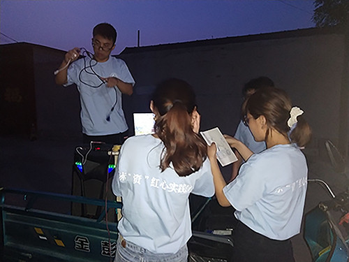 活动开始前,实践团成员按照安排清点实践物资,在确认设备完备后对播放设备进行调试,寻找合适的播放电影的广场,并在将要播放电影的广场上拉好隔离带,座位摆放整齐。准备就绪后实践团队员前往村中广播站向村民传达播放电影的通知,并提醒他们带好口罩。夜幕降临后,活动正式开始。实践团放映的第一部电影是《闪闪的红星》,这部电影讲述在艰难困苦的环境中成长起来的少年英雄的故事。电影时长为100分钟,在观看过程中村民们都格外认真,感悟了爱国英雄的艰辛历程。电影结束后,团队人员和村民们合影留念。