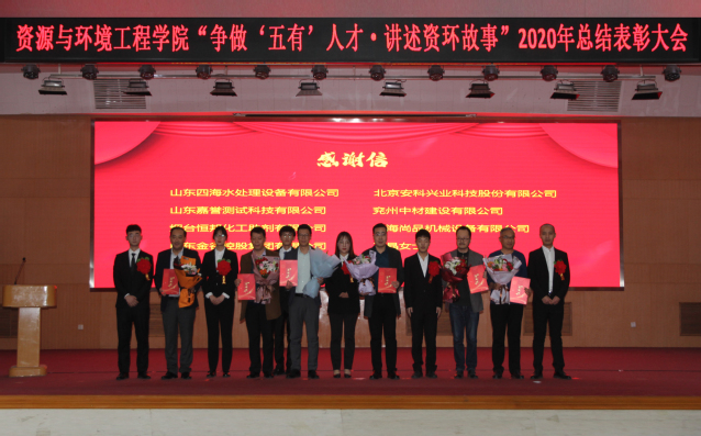 公司党委常委、副董事长王立斌,员工工作处处长赵明,团委副书记刘中合,创新创业公司副经理曹绪亮,资环公司经理陶东平,执行经理李明,经理助理刘晓出席表彰大会。四海水处理设备有限公司副总经理郭兆新、曾庆波,嘉誉测试科技有限公司副总经理王强,威海尚品机械设备科技有限公司副总经理丛龙斐,兖州中材建设有限公司副总经理李绪杰,山东金谷控股集团有限公司人力资源部部长齐晖,烟台恒邦化工助剂有限公司副总经理刘慎常、选矿实验室副主任宋超受邀参会。资环学院全体辅导员及员工代表400余人参加表彰大会。会议由党总支副书记秦伟伟主持。