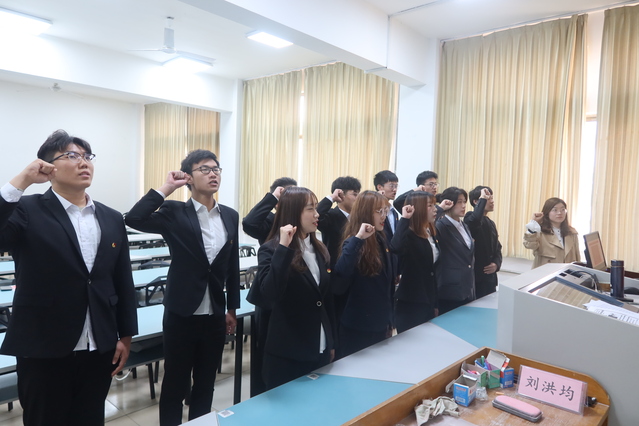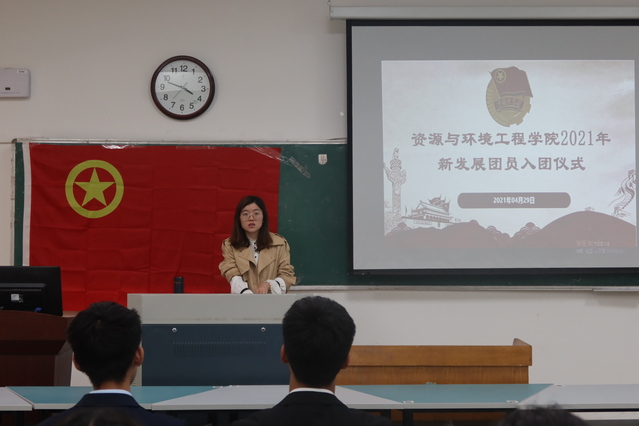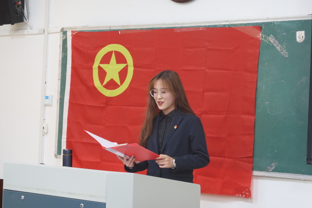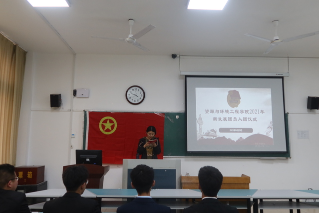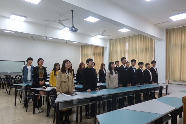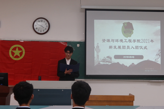会议开展第一项,全体人员起立奏唱国歌。张媛说明举行入团仪式的意义,并宣读新发展团员名单。团总支老师依次为新发展团员颁发共青团徽章,带领新发展团员宣誓。