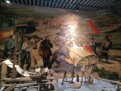 随后讲解员带领成员们来到支前厅,动情的向我们讲述了人民踊跃支前那动人的一幕幕:母送子、妻送郎、妹妹送哥上战场;沂蒙六姐妹主动挑起拥军支前重任,为部队当向导、送弹药;在冰冷的汶河水中,30多名妇女一字排开架起了“人桥”,保证部队战士从他们的肩头踏过成功渡河……沂蒙人民的无私奉献,将士的英勇无畏,深深地令实践团成员动容,在心头久久挥之不去。