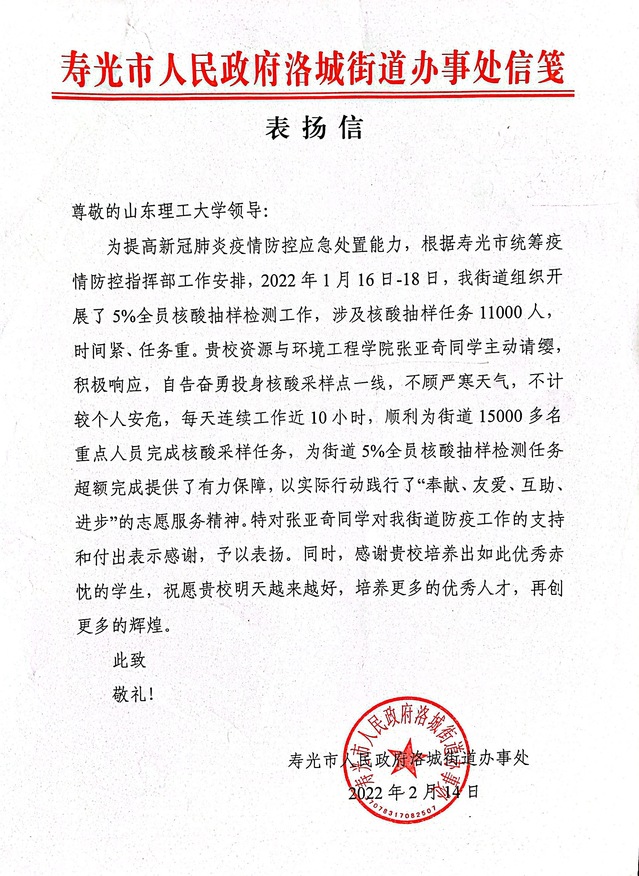信中写道,“贵校利来国际张亚奇同学主动请缨,积极响应,自告奋勇投身核酸采样点一线,不顾严寒天气,不计较个人安危,每天连续工作近10小时,顺利为街道15000多名重点人员完成核酸采样任务,为街道5%全员核酸抽样检测任务超额完成提供了有力保障,以实际行动践行了“奉献、友爱、互助、进步”的志愿服务精神。特对张亚奇同学对我街道防疫工作的支持和付出表示感谢,予以表扬。同时,感谢贵校培养出如此优秀赤忱的员工,祝愿贵校明天越来越好,培养更多的优秀人才,再创更多的辉煌。”
