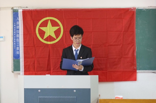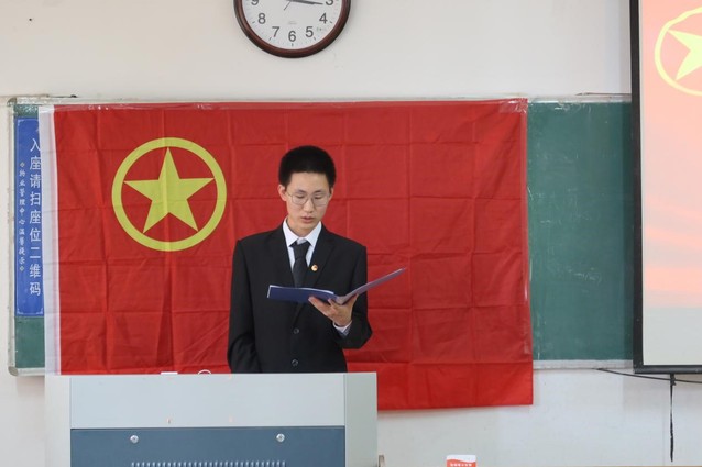 优秀团员代表赵海鹏上台宣读《团章》中有关团员的义务和权利的条款,从学习、宣传和团组织建设等方面介绍团员的责任和义务。赵佳佳老师带领新发展团员宣誓。