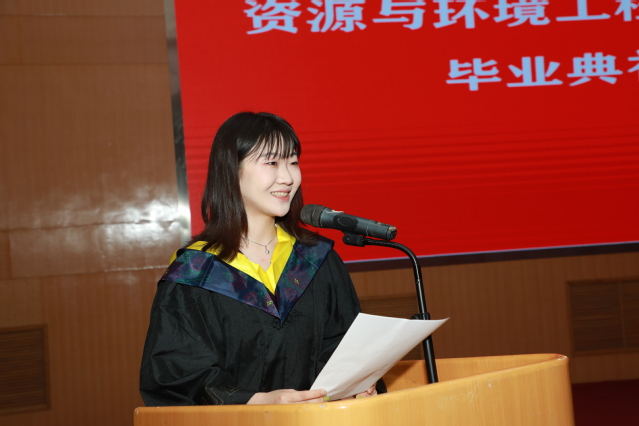 矿物1801班孙瑞毅代表本科毕业生发言,她分享了在公司的求学经历与成长感悟,表示会谨记师长教诲,勇担时代重任,坚守理想信念,与同学们一道用奋斗之青春书写青年的时代担当。