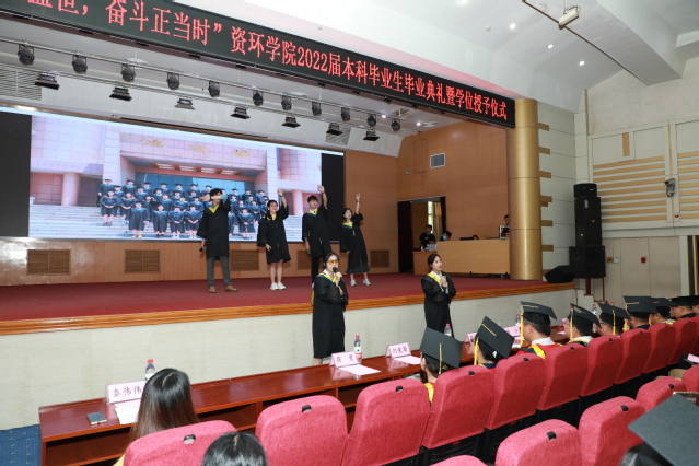 6名毕业生代表演唱《那些年》等歌曲,拉开了典礼的序幕,现场大屏幕上播放了2022届毕业纪念片,大家一起回首走过的青春岁月和难忘的校园生活,全体同学挥动右手,致敬青春,感动全场。