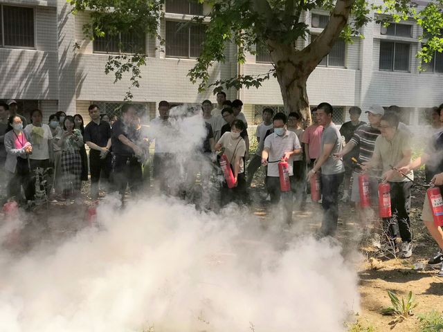 灭火演练中,安全管理处李刚老师讲解了灭火器的种类、操作方法和注意事项,指导师生进行了灭火器的操作。