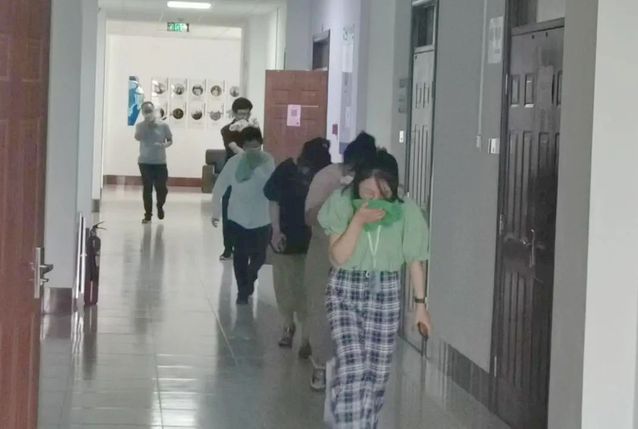 十点钟,工作人员在1号实验楼触发烟雾报警,1号实验楼全体师生做好防护,在三分钟内紧急疏散转移到安全区域,模拟了危急情况下师生撤离危险场地的情景。
