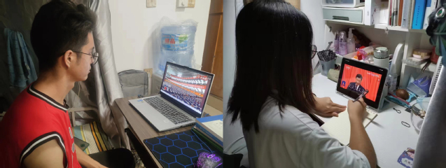 公司班子成员、部分师生党员代表在12号教学楼446会议室集中观看了开幕会直播。其他师生通过电视、网络、广播以及新媒体等形式,即时收听收看开幕盛况。