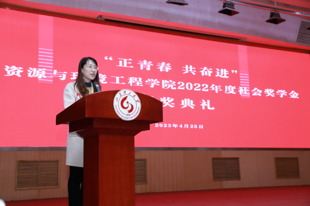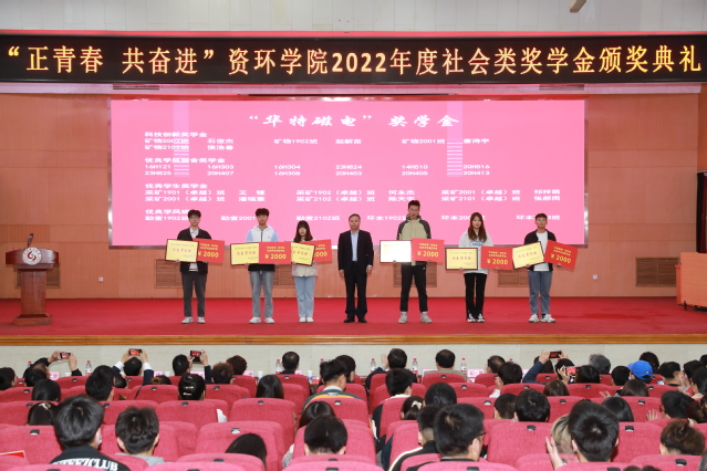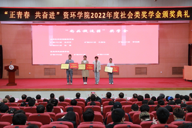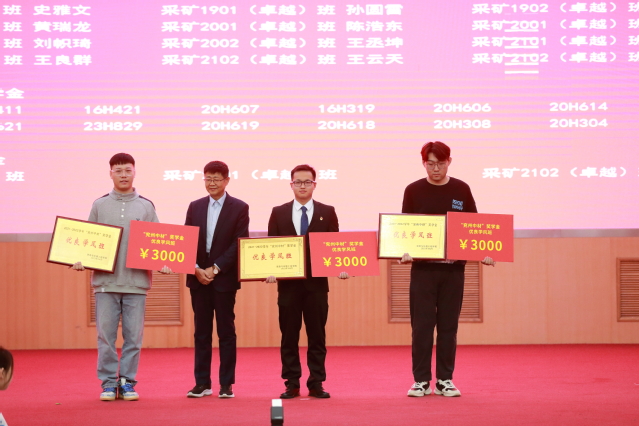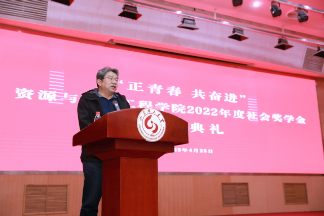 刘风亮代表捐资助学企业讲话,勘查1902班徐书慧、采矿2001班李渊昌分别作班级和个人成长故事分享。