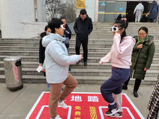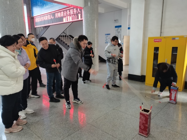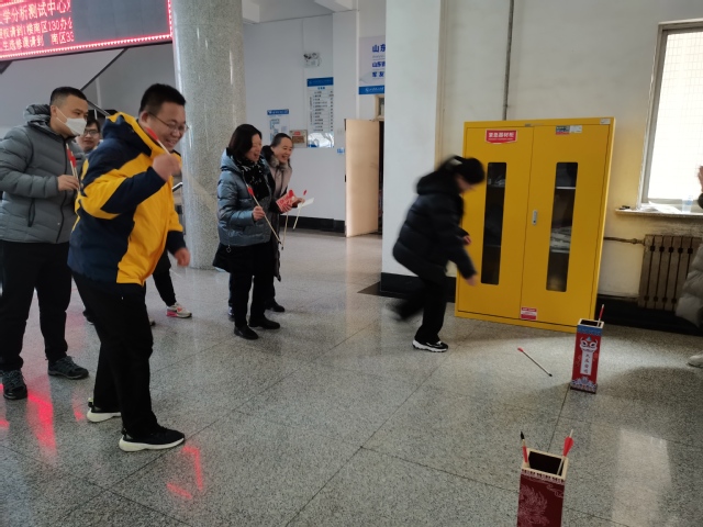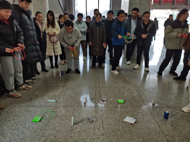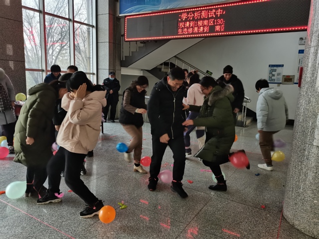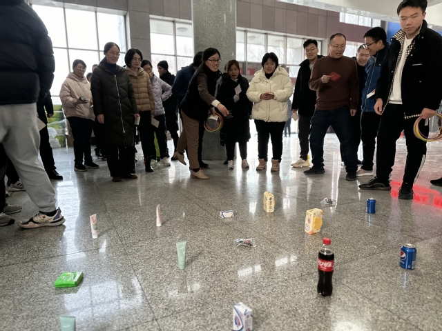 活动前,秦伟伟介绍了活动规则,代表院工会向全院教职工提前致以节日的祝福。参加活动的教师们现场领取新年贺卡并合影留念。为增加活动的竞技性和趣味性,本次趣味文体活动分为单人项目和多人项目两类活动,多人项目包括“趣味投壶”“一圈到底”“欢乐踩气球”“蒙眼原地踏步走”等4项活动,大家积极参与,配合默契,现场气氛热烈融洽,掌声、喝彩声、欢呼声此起彼伏。大家凭活动竞技赢得的印章兑换套圈,参加“开心套圈圈”单人项目,赢取了精美礼品。最后,公司工会通过“幸运红包墙”抽奖的方式为所有参加活动的教职工送上了纪念品。