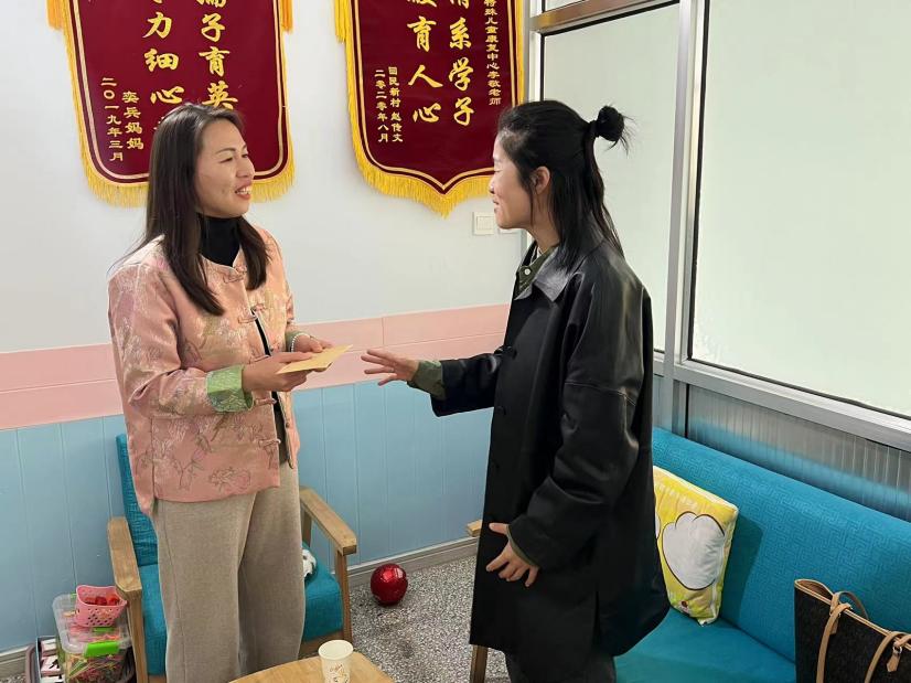 赵佳佳代表公司将“希望小屋”义卖所得1844元收益及慰问品捐献给了启音特殊儿童康教中心。