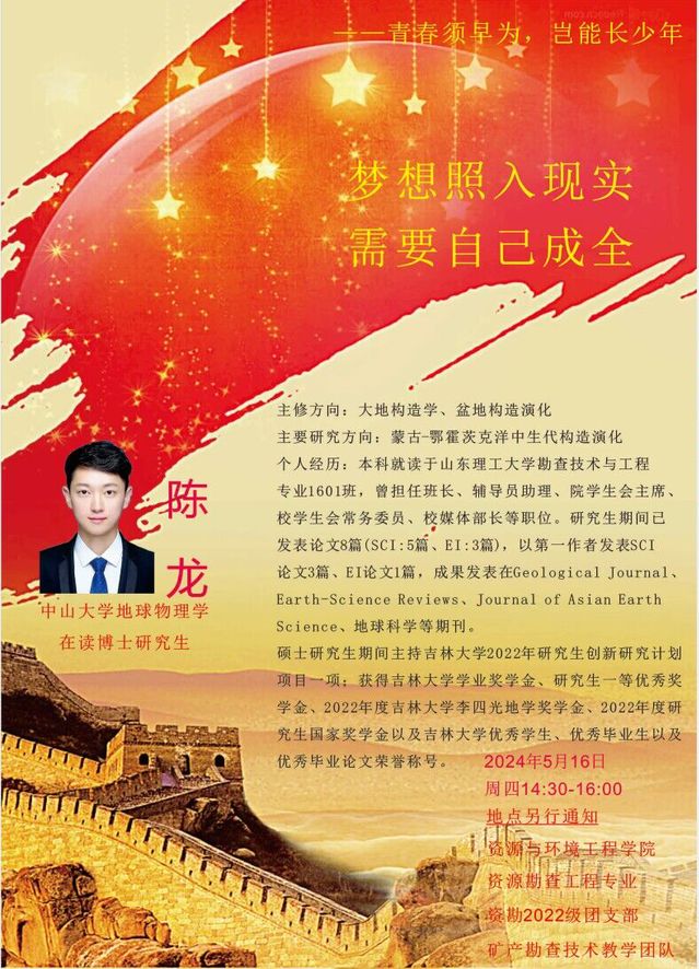 为巩固深化团员和青年主题教育成果,突出专业人才领航作用,提升团日活动的专业融合度、实景体验感和育人实效性,5月17日下午,公司邀请2016级勘查技术与工程专业优秀员工陈龙在3号教学楼105教室开展了“齐稷领航”优秀员工走进团支部主题团日活动。资勘2021级、2022级团支部参加活动。
