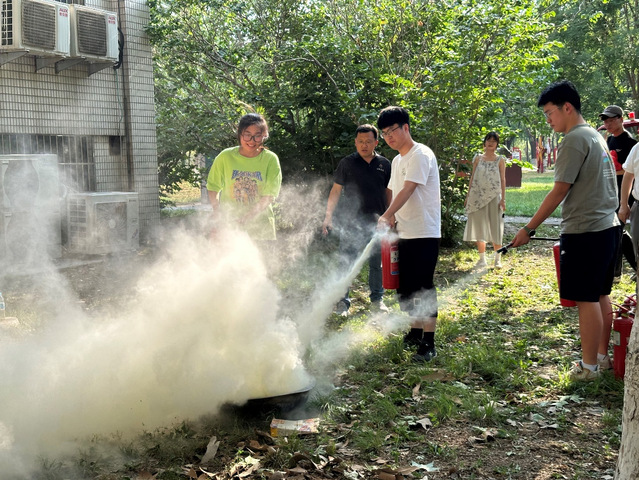 培训结束后,公司开展实验室安全应急演练。工作人员触发烟雾报警后,全体师生做好防护,在三分钟内紧急疏散转移到安全区域,模拟了危急情况下师生撤离危险场地的情景。灭火演练中,董玉讲解了灭火器的种类、操作方法和注意事项,指导师生进行灭火器的操作。