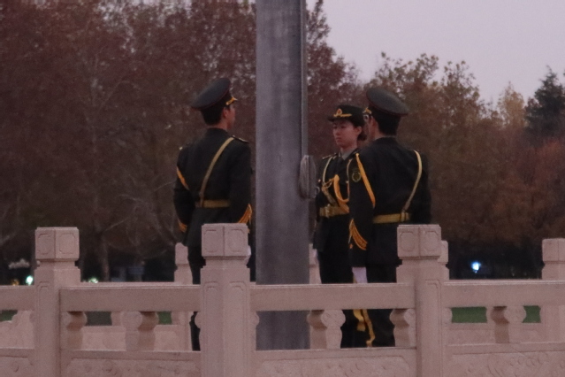 6时30分,仪式开始。国旗护卫队身着戎装,迈着整齐的步伐,护送国旗至升旗台。伴随着庄严的国歌声,五星红旗冉冉升起。全体师生庄严肃立,行注目礼。