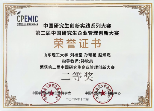 11月30日至12月1日,第二届中国研究生企业管理创新大赛全国总决赛在成都科幻馆举行,本届大赛分为企业决策和商业分析与智能应用两个赛道,共吸引来自298所高校的14433人次的研究生参赛。由孙钦泉老师指导、公司研究生刘福堂带领的“天道酬勤队”最终获得企业决策赛道(其他研究生组)全国二等奖。
