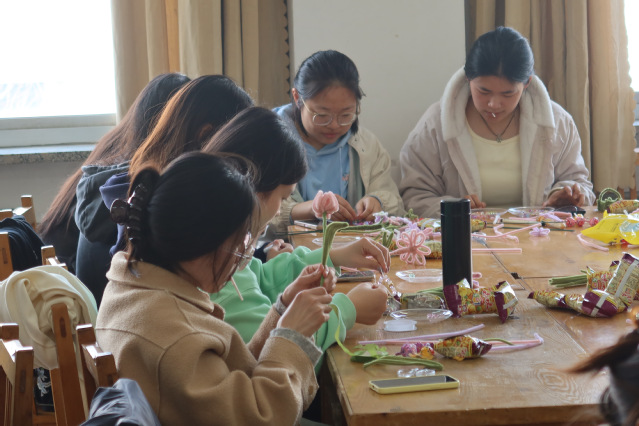 活动分为DIY手链与DIY花束两个项目,女同学们分组同时进行,现场气氛热烈。DIY手链区域,大家或是独自琢磨编织思路,或是围坐交流设计灵感。彩色丝线被同学们用四股、八股等编法,交织成一条条精美的手链。DIY花束工作台前同学们围坐一起,皱纹纸、铁丝在同学们手中被裁剪、缠绕,编织成一朵朵栩栩如生的花,组合成五彩斑斓的花束,美不胜收。