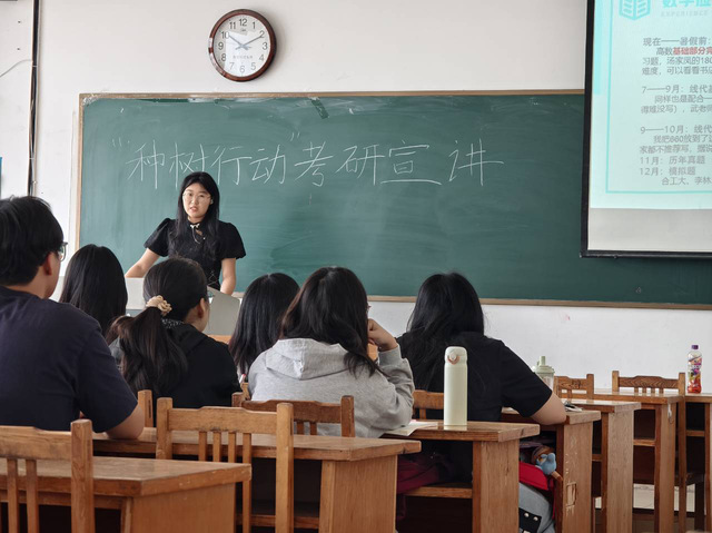 宣讲会上,“种树行动”宣讲团成员围绕考研备考整体过程展开交流,结合自身经历,详细讲解了院校选择策略、时间规划方法及复习资料筛选技巧等。他们建议低年级同学们根据专业实力、地域优势等因素理性择校,并将备考划分为基础、强化、冲刺阶段;同时强调“适合自己才是最好”,引导同学们避免盲目跟风购买复习资料。面对备考压力,宣讲团成员们鼓励同学们保持积极心态,通过规律作息、适当运动等方式缓解负面情绪,以饱满状态投入复习。