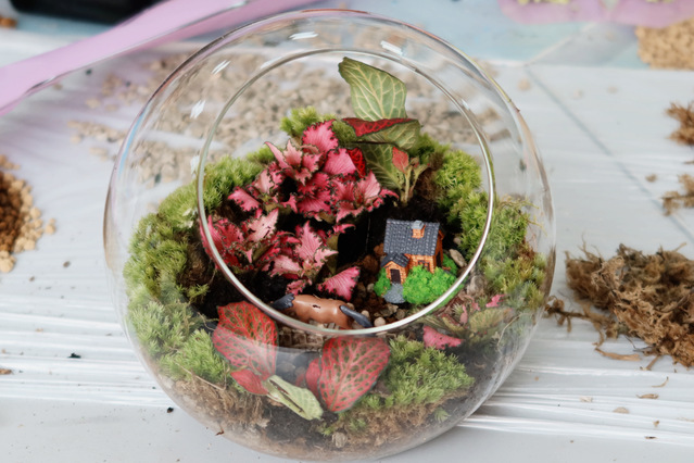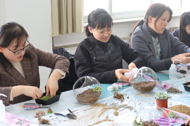 随后,专业花艺老师为大家讲解了微景观制作的基本知识与技巧,并现场示范创作过程。教职工们兴致盎然,纷纷动手尝试。在工作人员的细致指导下,大家精心构思布局、巧妙搭配材料、耐心点缀装饰,沉浸于手工创作的乐趣之中。现场气氛热烈融洽,彼此交流心得、分享灵感,在亲手劳作中感受着手工艺术的独特魅力。经过一个多小时的精心制作,一件件精致灵动的微景观作品逐步呈现。每个作品都凝聚着老师们的巧思与匠心,也寄托了大家对美好生活的热爱与向往。